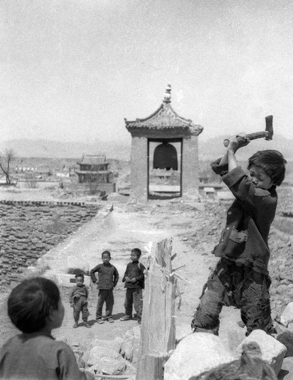 1945年,八路军解放山西灵邱城后,儿童斧劈堡垒残木。沙飞/摄。