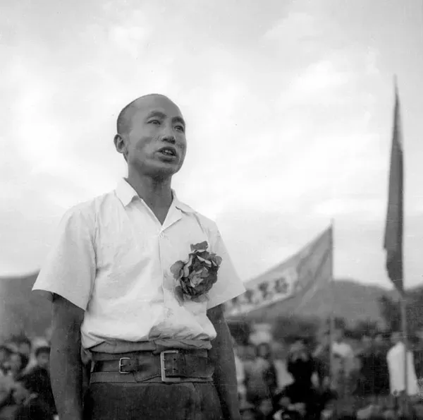 1946年8月,河北张家口,工人踊跃参军,新战士代表讲话。沙飞/摄。
