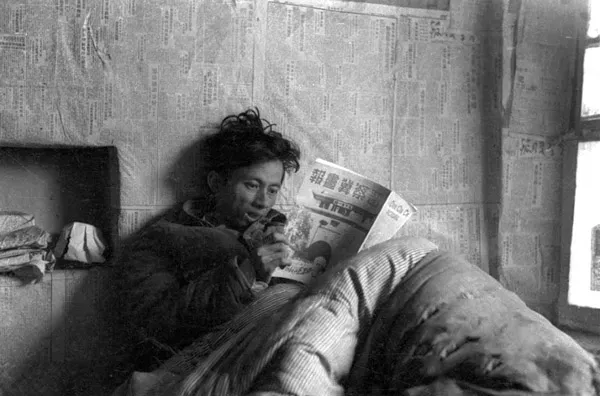 1946年,许群在医院休养时看画报。沙飞/摄。