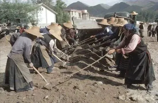 1979年改革开放初期,西藏人民在修路。