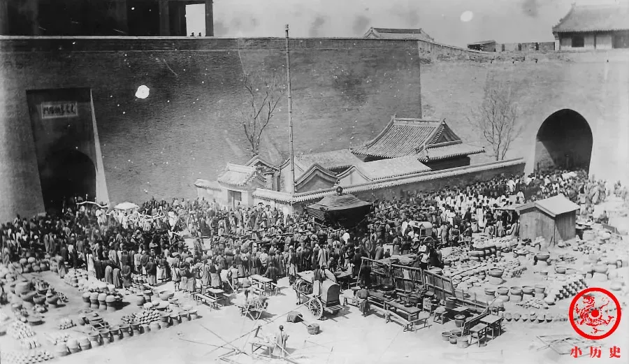 一支出殡的队伍正走出朝阳门,浩浩荡荡,挤满了出城的道路,显然属于大富大贵之家。瓮城西北角城墙下的那个小院是关帝庙,地上的摊位则是缸瓦市。