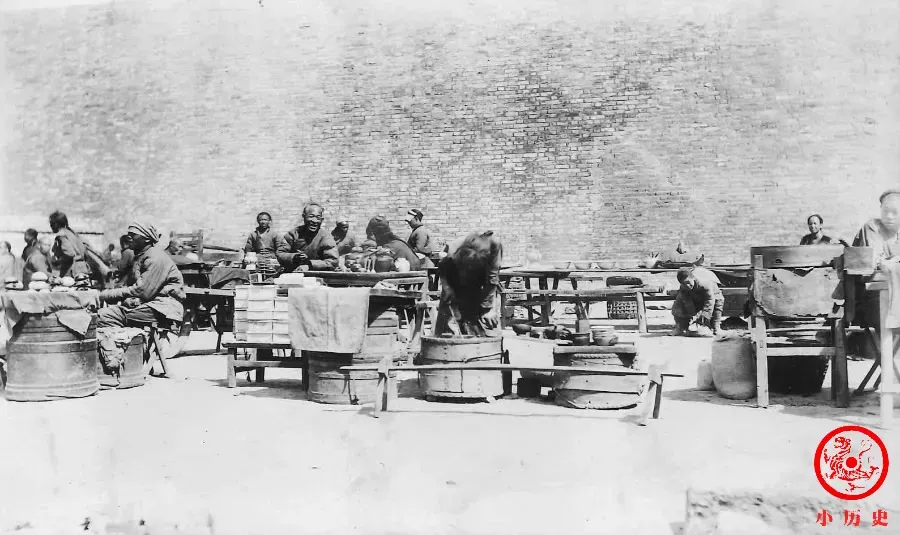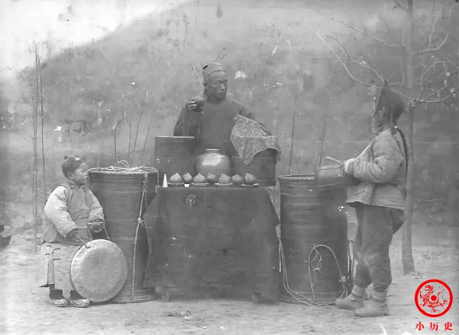 这张照片记录下的摊位均为小吃买卖,见证了老北京的饮食文化。老北京小吃既便宜又丰富,堪称“吃货的天堂”。《都门竹枝词》道:“日斜戏散归何处,宴乐居同六和局。三大钱儿买甜花,切糕鬼腿闹喳喳,清晨一碗甜浆粥,才吃茶汤又面茶;凉果糕炸糖耳朵,吊炉烧饼艾窝窝,叉子火烧刚卖得,又听硬面叫饽饽;烧麦馄饨列满盘,新添挂粉好汤圆,爆肚油肝香灌肠,木须黄菜片儿汤。”极言风味小吃琳琅满目。