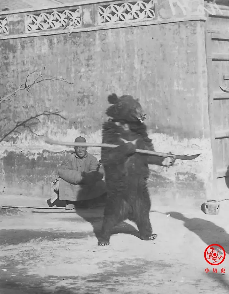 在演员的调教下,狗熊站立着,用爪子来回转动将近两米长的大刀,非常熟练,憨态可掬滑稽可爱。此外,这只狗熊还会翻跟头。