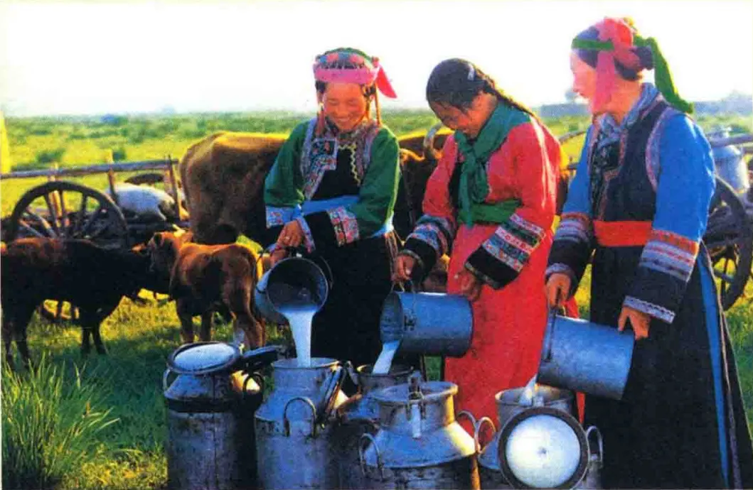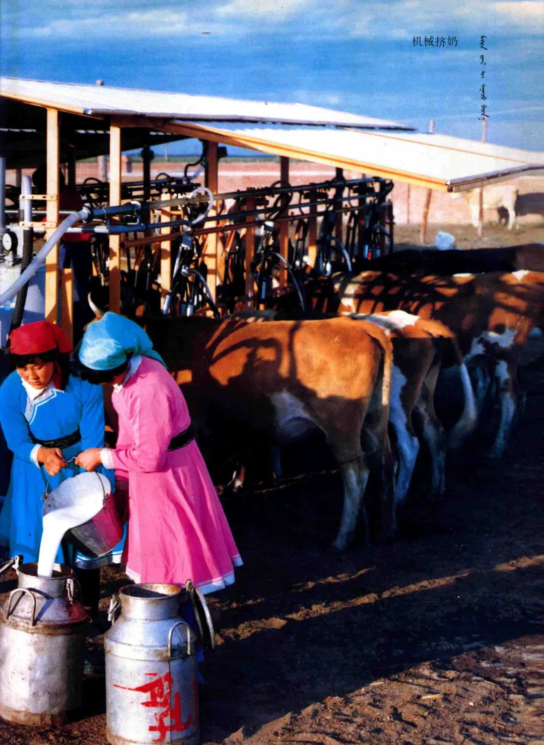 身穿特日勒格与敖吉的科尔沁妇女收集牛奶