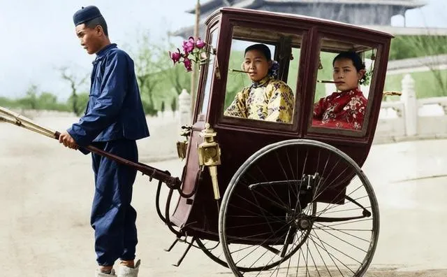 车夫推着车,手脚利索,蓝布褂子干净得体,那股劲就是干惯了的老师傅,小时候听我姥爷念叨这行,说“车夫讲究能吃苦,白天黑夜都得蹬,穿不住好皮鞋,全靠脚力”,现在马路边是小轿车、电瓶车,那种靠两条腿挣钱的身影想见都难。