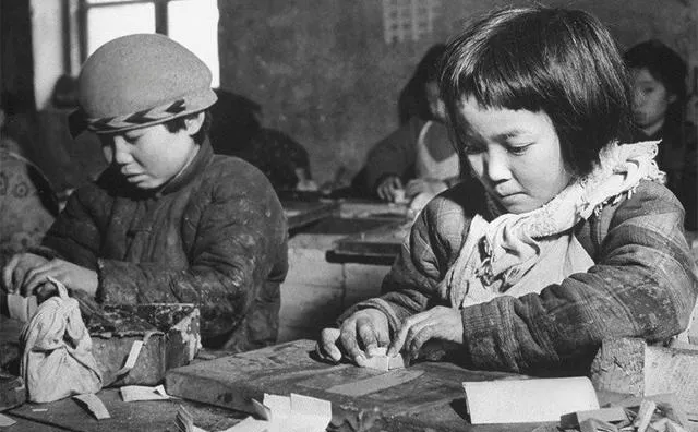 这个画面看着心里咯噔一下,几个孩子趴在桌子边,小手里头全是纸条、木棍,脏兮兮满是烟火气,这就是那阵的火柴厂,十来岁的小童工干的是切火柴梗、糊盒的活,环境灰扑扑,身上衣裳厚实又破旧,干起活来下手都快,头也不抬,一屋子的孩子,谁家日子紧巴才舍得让娃去厂里赚个伙食钱。