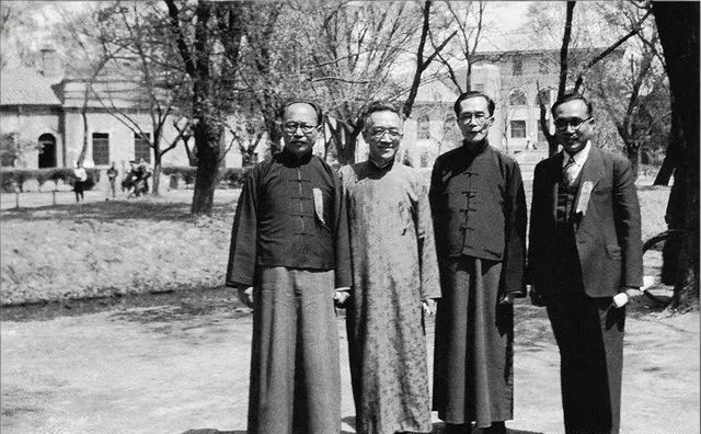 站在清华园的草地上,四个人穿着长袍、呢子大衣,身板都挺直,肩上别着小牌子,是三校会友的排场,那年是清华校庆搞的大活动,北大、清华、南开的老师凑到一块,合个影就是一段历史留在照片上。