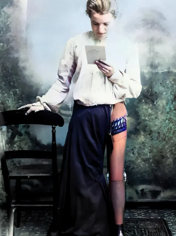 一张1902年的老照片,一个女子坐着,裙子微微掀起,露出一条腿.露出来的那条,是假的.