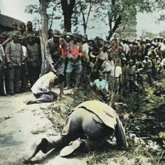 一张1937年的老照片,南京.两个中国人跪在地上,低着头,看不到脸.旁边站着几个日本兵,其中一个举着军刀,正要往下砍.