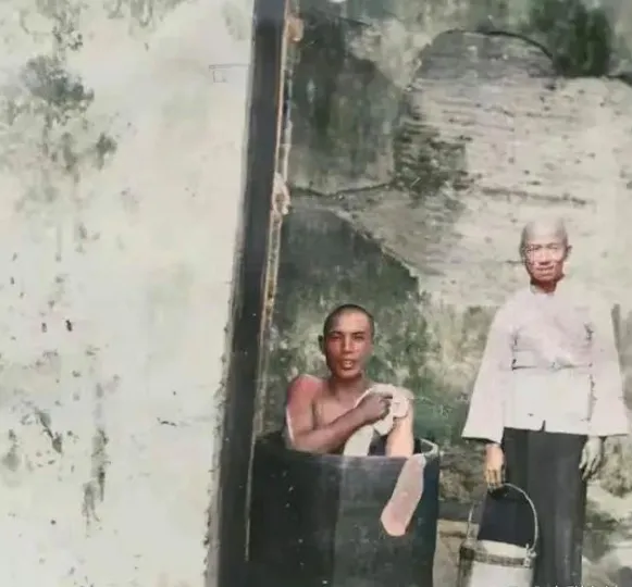 照片里他穿着长衫,站在自己家院子里,旁边是一个泡澡用的大木桶。