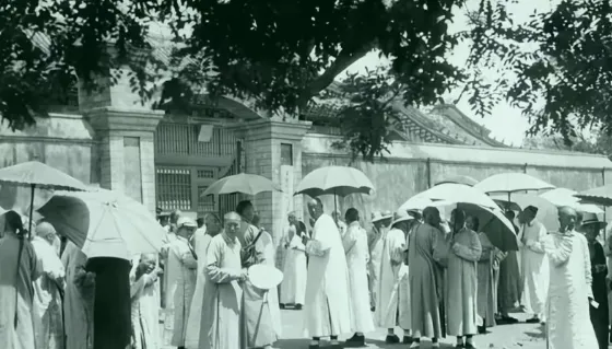 永寿宫前面站着一排穿军装的人,他们袖口上有白底黑边的臂章,都不说话,只顾低头翻册子、核对东西、签字,太监和宫女排着队领遣散费,有人撑着油纸伞,有人摇着团扇,但没人敢问一句原因。