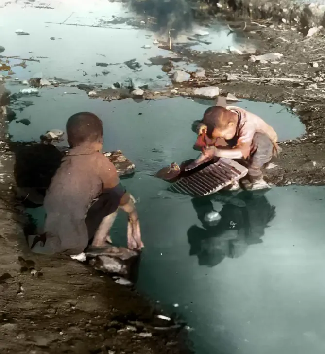 一张1937年的老照片,抚顺.冬天冷得要命,孩子穿着单衣,蹲在河边洗衣服.洗的不是自己的衣服,是别人的.小小年纪就得干活,养家.