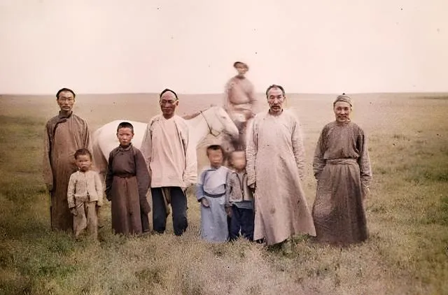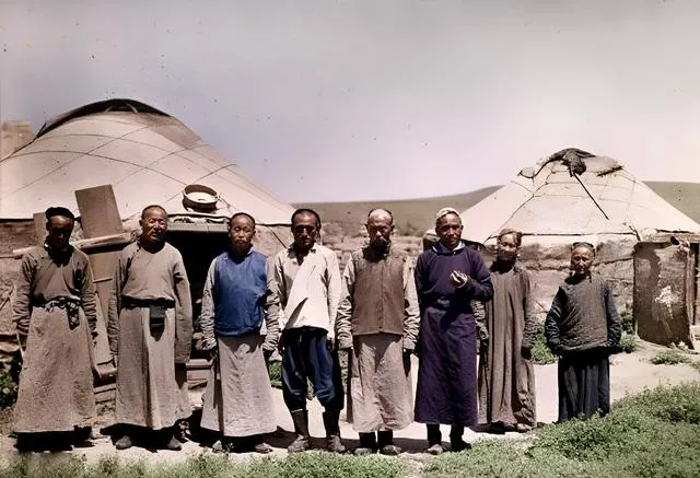 最后再来一张家乡牧民的合影,无边大草原,一群人悠然自得地站在羊群和蒙古包旁。你看他们脸上的笑容,是不是透着那种**“简单就是幸福”**的淳朴?百年过去,笑容却从未变淡。