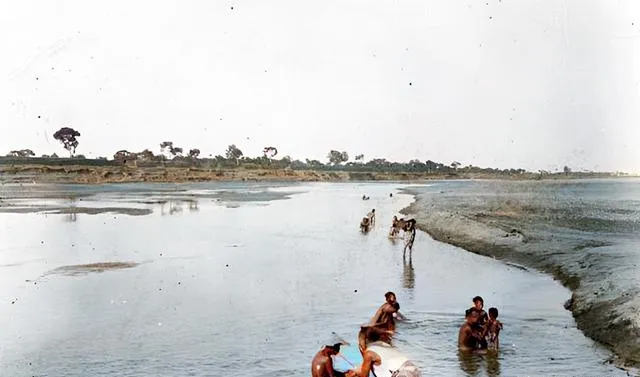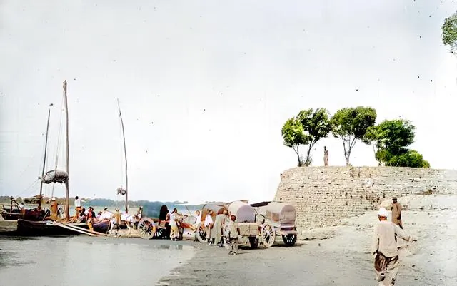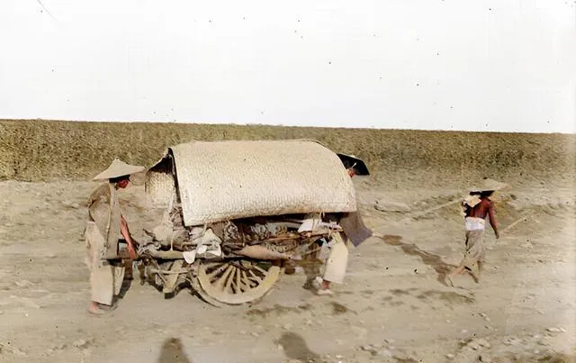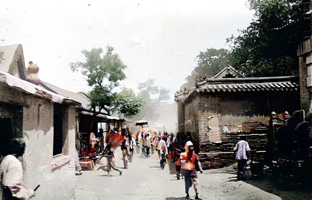 照片里孩子们在泗河里洗澡嬉戏,妇人在门口纳凉,街头独轮车轱辘咕噜噜地推着走,还有过河的队伍和满载物资的马车。这种感觉,就像咱现在去农村赶集,路上全是人气,一派热闹生机勃勃!