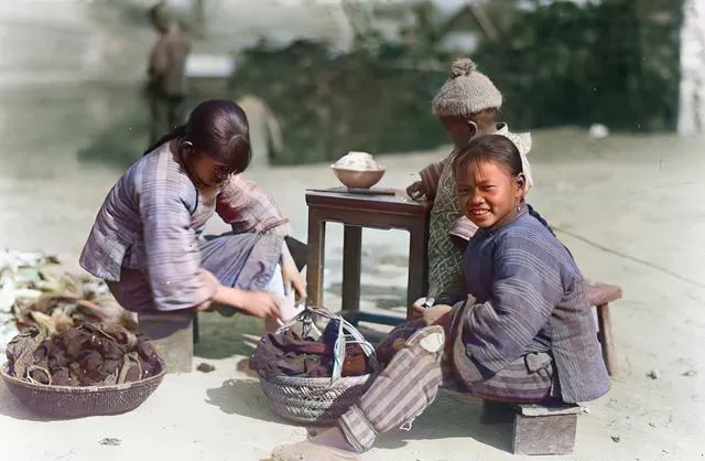 你以为这些老照片只有古建筑?老镇江的生活气息,同样浓烈得很呀!看,这两个小姑娘正坐在门口,篮子里是刚洗好的衣服,旁边一个小弟弟看得正起劲,笑得可甜了。是不是和现在孩子们的天真样子一模一样?
