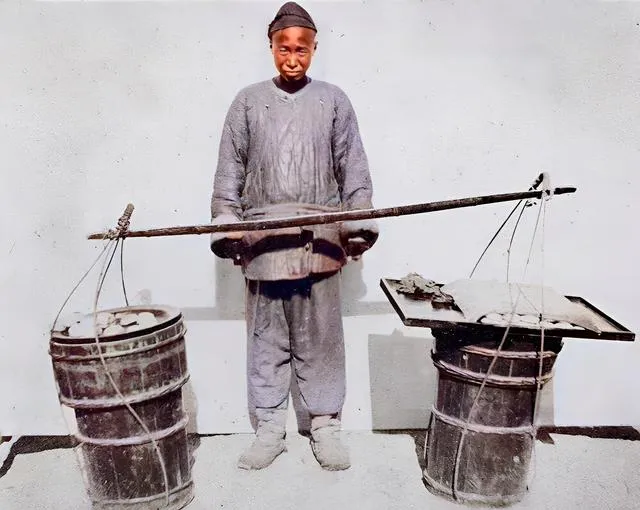 看到老照片最打动我的地方,是普通人的生活场景。比如挑着担子沿街叫卖的小贩、推着推车卖小吃的男生,脸上还带着点羞涩和期盼。那时候的街头没有什么装修豪华的饭馆摊位,扁担一挂、锅灶一支,就是活色生香的“老上海味道”。