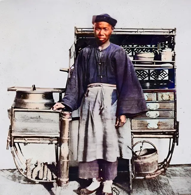 你看看这位卖瓷器的小贩,眼里满是憧憬,身后还坐着几个外国人,一起合个影,有点像现在游客打卡网红摊,画面感十足,真的让人忍不住嘴角上翘。