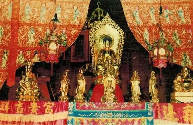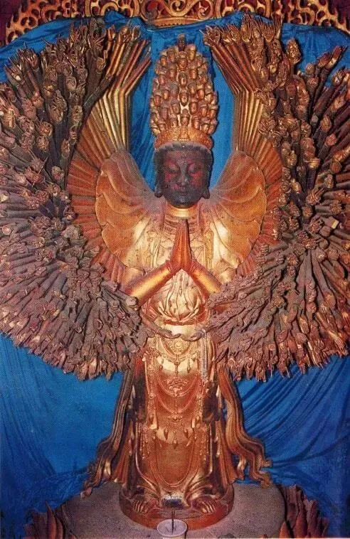 在龙山寺的大殿正中,有一尊巍峨轩昂的千手眼佛。这是一尊连接石莲台上的木雕立佛,他头戴花冠,面目清秀,耳大嘴小,下颚半圆,显得十分秀丽慈祥。佛的肩膀下面,主手垂弯合拱于胸前,手之两侧则旁生出一千零八只手,每只手掌心各雕一只眼,带镯,分别拿着书卷、钟鼓、珠宝、花果、乐器等多种多样的物品。据说,整座二米多高的立佛像,是用一株千年古樟树的躯干雕刻而成,是我国古代木雕艺术中有很高艺术价值的珍品。