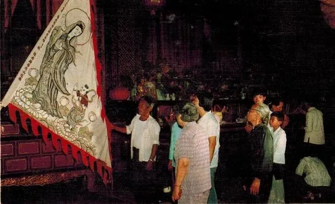 图为1948年台湾省台南县乡民来龙山寺进香时送的三角旗。