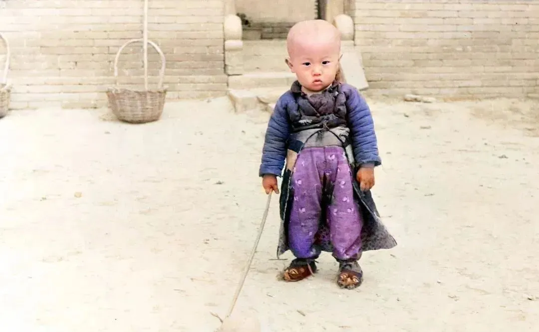 一个两三岁的乡村娃,穿有衣服也太有个性了。当时是1946年,他如果健在,如今已是一位八十多岁的老爷爷了。