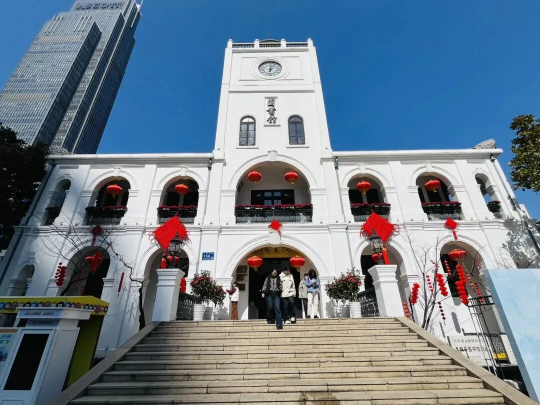从阿炳故居出来,一墙之隔,一座白色的民国建筑静静矗立,这便是无锡县图书馆旧址,建成于1915年,至今已有一百一十多年历史。这座两层楼的建筑,融合了中西风格,在周围的现代高楼中显得格外沉静。