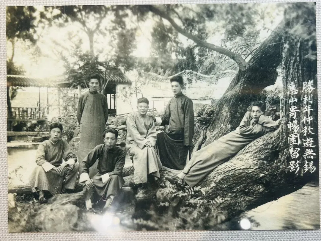 走进馆内,一楼展厅里,一组老照片吸引了我们。那是1945年中秋,六个青年在寄畅园水畔的合影。照片已经泛黄,却依然清晰——六张年轻的面孔,意气风发,他们或坐或站,背景里那棵歪脖子柳树格外醒目。柳树斜斜探向水面,枝条垂落,仿佛要拂动那一池秋水。