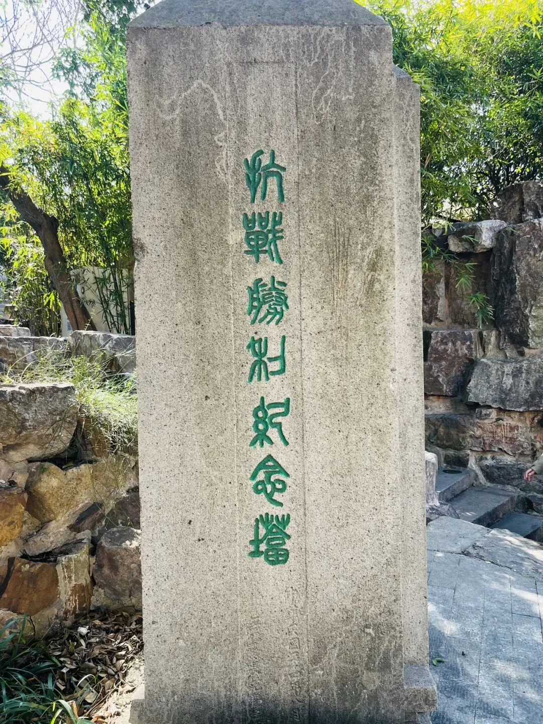 公园僻静的一角,一座不起眼的纪念碑静静伫立。这是抗战胜利纪念碑,绿色的篆字刻着碑文,旁边的雕塑是花篮造型,寄托着对先烈的缅怀。站在碑前,刚才的热闹远了,只剩下肃穆。那些年,那些事,那些为了这片土地献出生命的人,应该被记住。