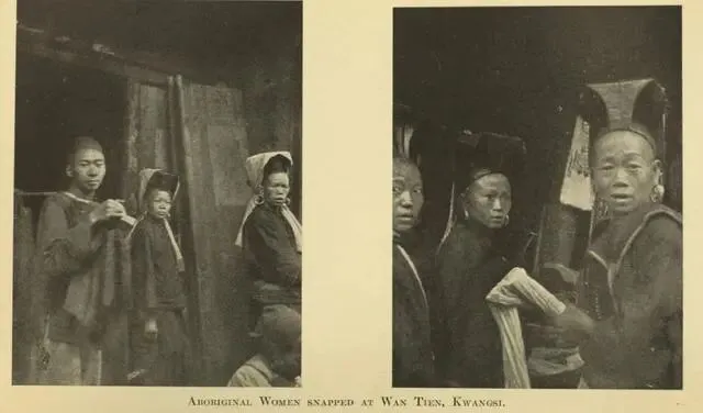 广西桂林的本地人装扮。妇女耳朵上都戴着大耳环,头上是特色鲜明的头饰。