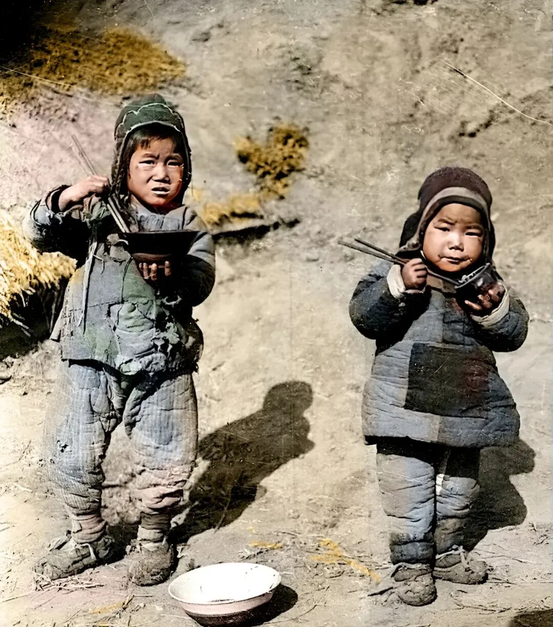 图中这两个小不点儿端着粗瓷碗吃饭,这碗口沿有道磕痕,白里发灰,里面汤水清得见底,筷子是细竹片打磨的,边上那只大海碗落在地上,碗底一道暗红釉圈子挺扎眼,衣裳是厚棉袄拼补起来的,肘弯处打了好几处补丁,鞋面开了口还用麻绳勒着,地面是风吹过的黄土,脚印一窝一窝的。