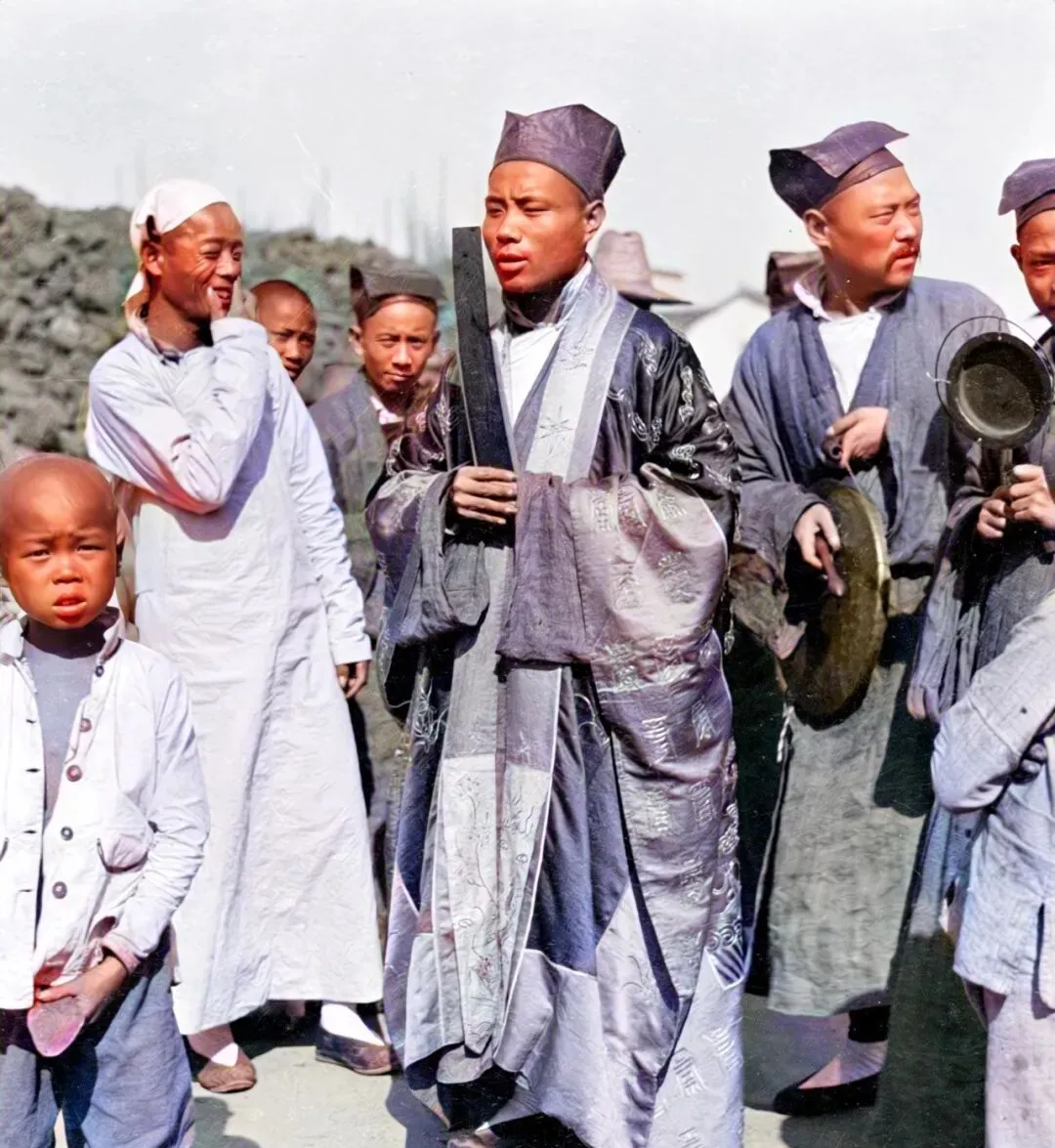 这个阵仗叫做法事,以前葬礼上请僧人多一些,这家却请了道士,嘴里念念有词,脚步一落一顿,节拍规矩得很,敲锣的抡起手腕,声儿不大却顶在心口上,一旁的小孩仰脸看热闹,脑门反光,估计是刚剃的头。