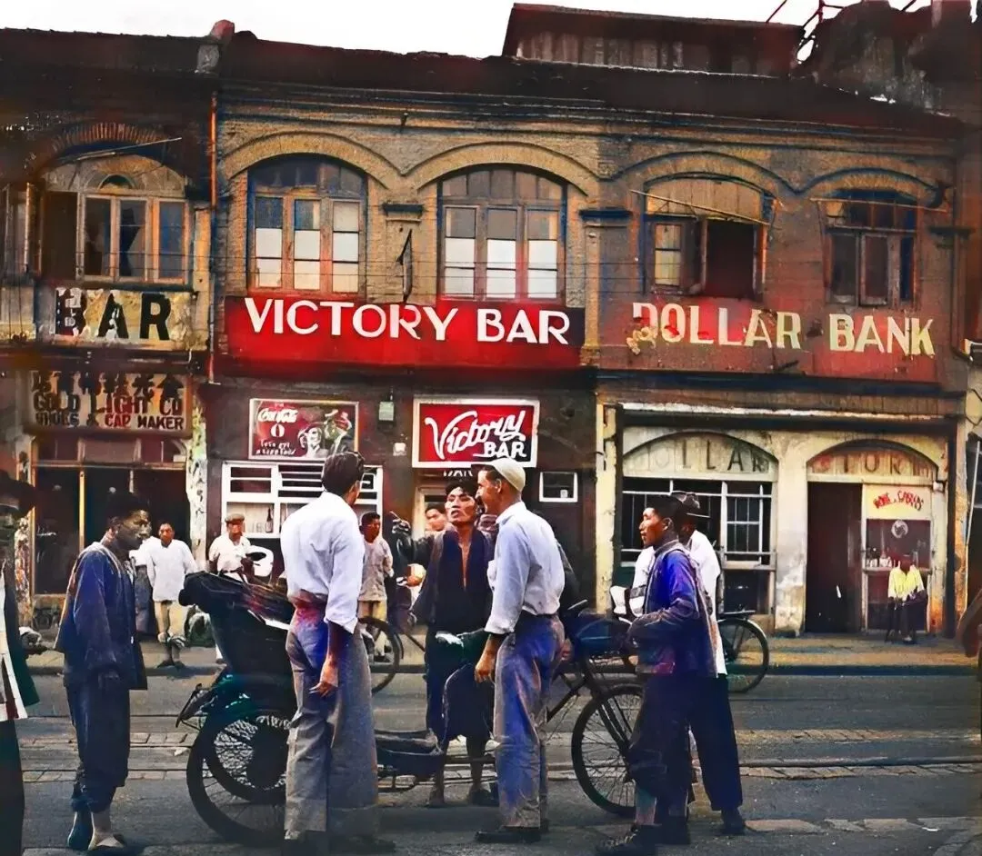 这处发生在胜利酒吧门口,红底白字的招牌很醒目,门脸子上剥落的漆露出旧砖,前头一辆黄包车歪着把手停在路边,车夫年轻,袖口卷到胳膊肘,正指着两位高个子的鼻子说话,嘴张得大,旁边人围成半圈,表情各不相同,路面是细碎的石板,擦得有点亮。