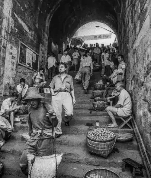 这个场景地道得很,重庆老城的石阶巷子一层叠一层,专治不服的坡道和天生的 锻炼场,石阶沿边全是挑担卖货的小贩,大部分挑一担柴米油盐,有的还一边吆喝一边跟人讨价还价,小时候跟妈下城,腿还没台阶高,左闪右躲的窜到巷子口去买削好的梨块,耳朵里留下的就是叫卖声和吆喝声。现在路都变平了,电梯地铁到处都是,这种“爬坡上坎”的阵仗没人习惯了。