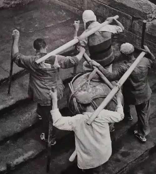 这个画面是地道的重庆“棒棒军”,几根长扁担往肩上一顶,大物件靠人力抬上石梯,没有车进得来,全靠这一身膀子上的劲,棒棒吆喝一声,大家一起发力,“一二三”就往上走,有时候下雨天,石梯滑得像抹了油,棒棒们从不嫌苦,“吃这碗饭”,重庆人骨头里那股不认怂劲儿就靠这些年练出来的,现在楼道里哪还见得到这场景了。