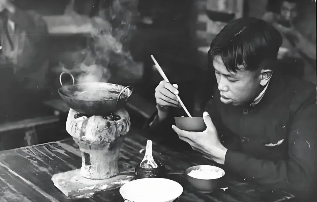 图上那个男子,铁锅搁陶制炭炉上,锅里红油冒着滚沸的泡,一边吃一边扒拉饭,火锅边有一摞小碟,全是佐料,老重庆街头谁家不来上一口单人小火锅,挑个小板凳,边煮边涮,辣得直抽鼻子,三两好友凑一块,那才叫巴适,现在火锅店多了,烟火气却淡了点。