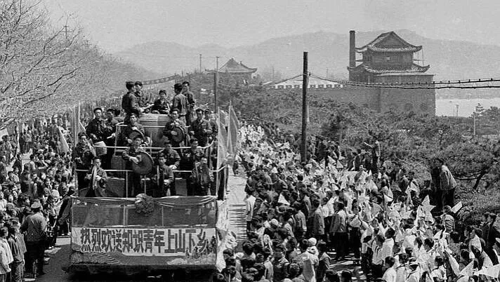 这张照片里的场面,一看就是上世纪知识青年上山下乡,卡车贴着“热烈欢送”的横幅,车上锣鼓敲敲打打,街道两边全是送行的人,帽子、花布大褂、手里的小白旗,都透着一种说不清的认真劲,爷爷以前说,自己那会儿是被簇拥着送走,队伍拉出去半天都看不见头,心里不知道是兴奋还是惶恐,这种场面现在再难看到了。