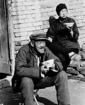 大碗粗瓷、棒子面粥,照片里老两口端着碗坐在屋外,空地上一只小板凳,围着砖墙随意一靠,嘴里唠着地里的收成,奶奶爱跟着爷爷后头蹲,听他说“今年庄稼要丰收”,小孩子就在边上扒拉草根,那种自在,甭提多惬意,现在谁还端着碗出门咬一口呀。