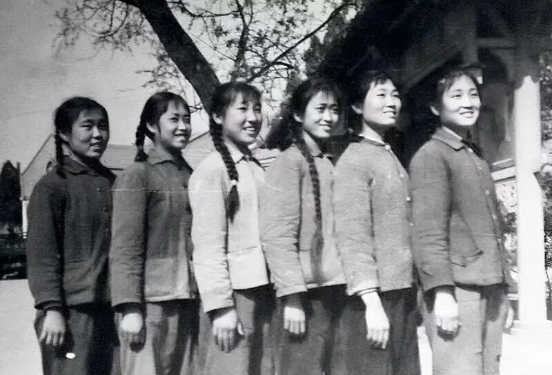 这一排姑娘,辫子咧嘴笑,身上粗布褂子,羽毛球似的队形,是那个年代最流行的站姿,姐妹几个叽叽喳喳商量造型,轮流调整谁站前面,衣服虽然都是灰青蓝三种,但笑容扎实,精神头不服输,穿过沉闷日子的女孩也有自己的时髦。