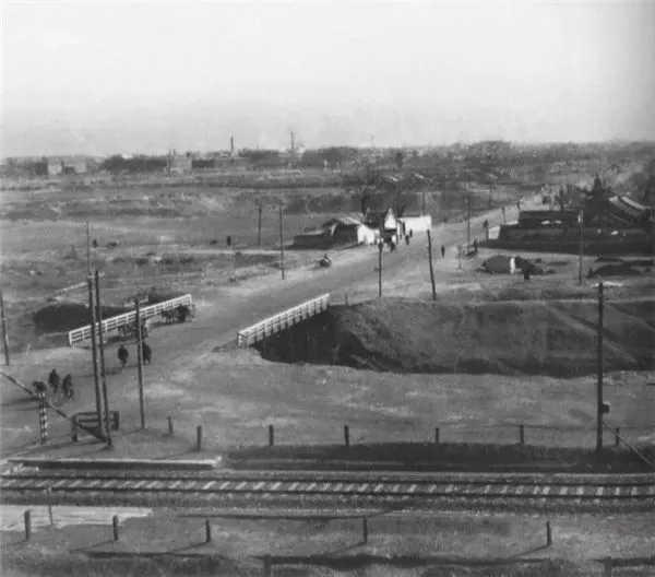 1950年,建国门外护城河桥,护城河内沿的环城铁道,建国门外大街。从古观象台向东偏北方向拍摄,城外附近还是基本荒芜,稍远芳草地以东可见有东郊的工业建筑。