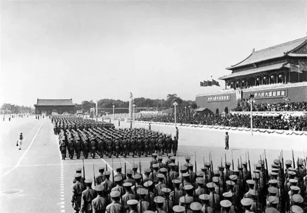 1950年,建国一周年国庆阅兵。步兵方阵通过天安门前,可见长安右门。队伍行进到长安右门要打散通过,解放军很是不爽,这埋下了日后要拆除长安左、右门的伏笔。
