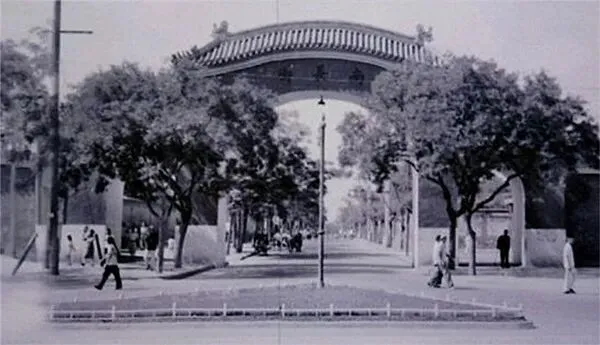 1953年,阜成门内大街历代帝王庙前“景德街”东牌楼(东向)。远处可见西四牌楼。