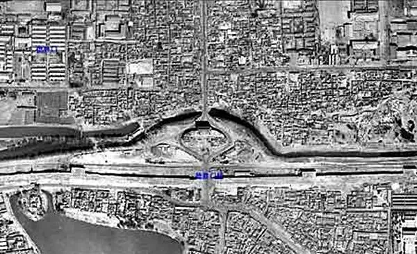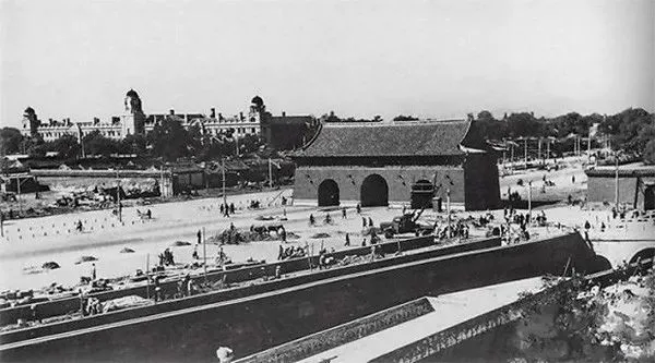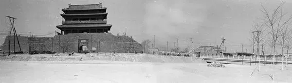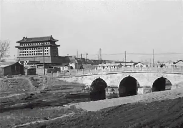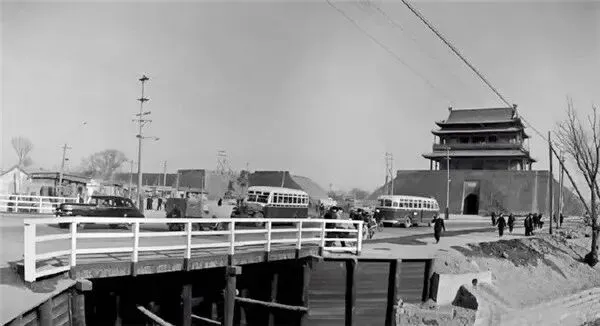 1956年,永定门箭楼外,东侧护城河桥。瓮城和周围城墙都已拆除,可见西侧的先农坛坛墙东南角及先农坛体育场。来年,独立的永定门城楼和箭楼均被拆除。