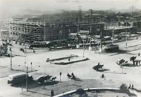 1957年,西便门外大街、南礼士路与复兴门外大街交叉十字路口,在路口东南角在建的中央广播大厦(苏联帮助设计)已接近封顶。