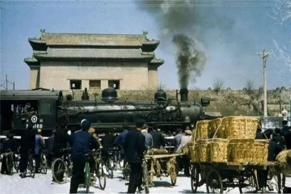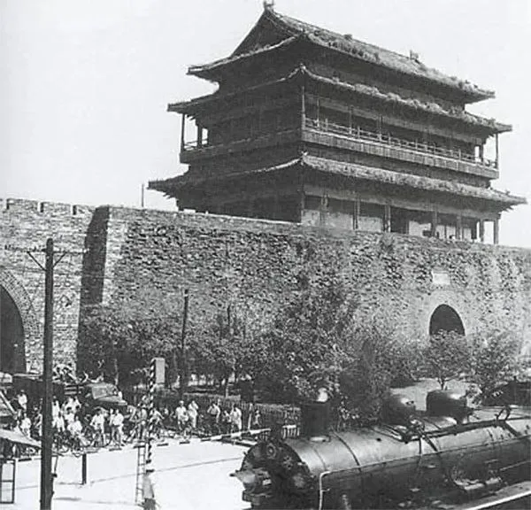 1953年,朝阳门城楼东北面,环城铁路道口。此图当为城楼最后遗照,当年10月即下令拆除。