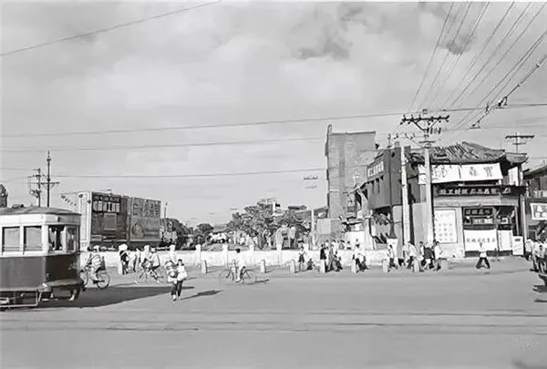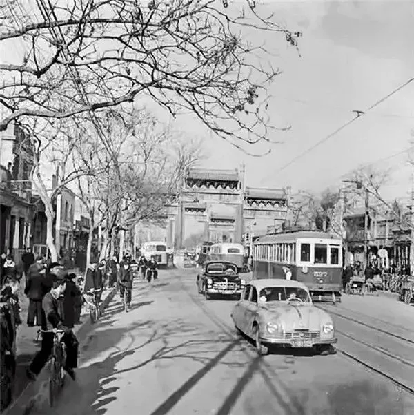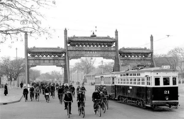 1953年,西四牌楼北向,有轨电车通过北大市街牌楼,画面左侧是转角楼新华书店朝东的铺面房。