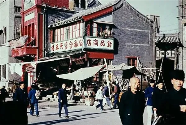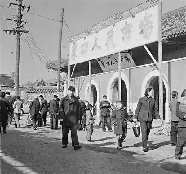 1952年,猪市大街隆福寺街口,东四人民市场已挂牌经营,隆福寺山门就是市场大门,商户都进了庙。这会儿董老还没给题字呢,那是等拆了隆福寺山门,盖了新门脸儿写的。