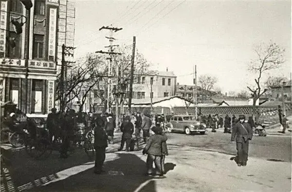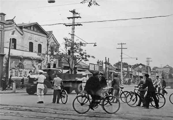 1953年,西单路口东南向。路上的交通工具有1辆日本丰田卡车,波兰华沙20轿车,有轨电车,人力三轮车和自行车。