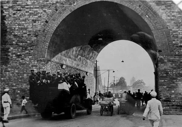 1951年,朝阳门城楼东面城门洞前,城门石匾“朝阳门”三字历历在目。赶大车,骑自行车进城送货,以及进城的行人。