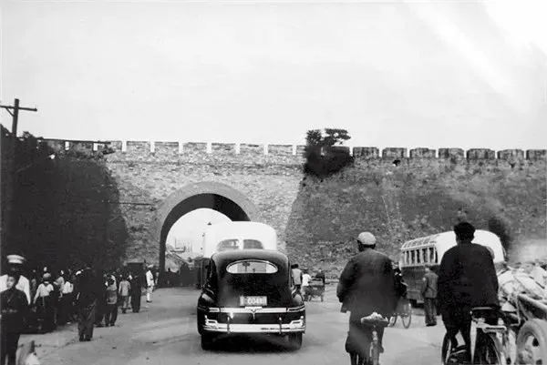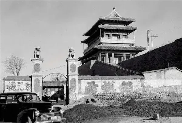 1958年,东直门城楼西南面,可见城楼南马道。城墙内侧的东元煤栈,门口停的轿车像是1940年前后的别克。