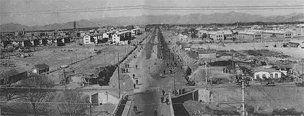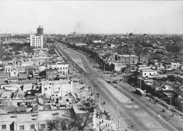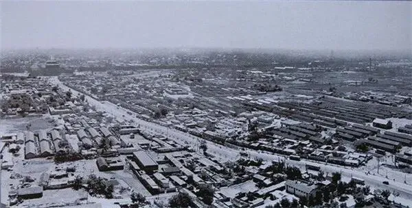 1956年,西直门外大街俯瞰。从苏联展览馆上向东拍摄。远处可见还完好的西直门和城墙。