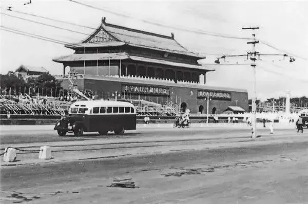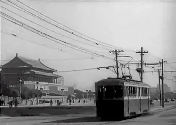 1951年,长安街天安门前。由电车公司修造厂仿制的法国100型机车及200型拖车成功,国产的有轨电车上路。